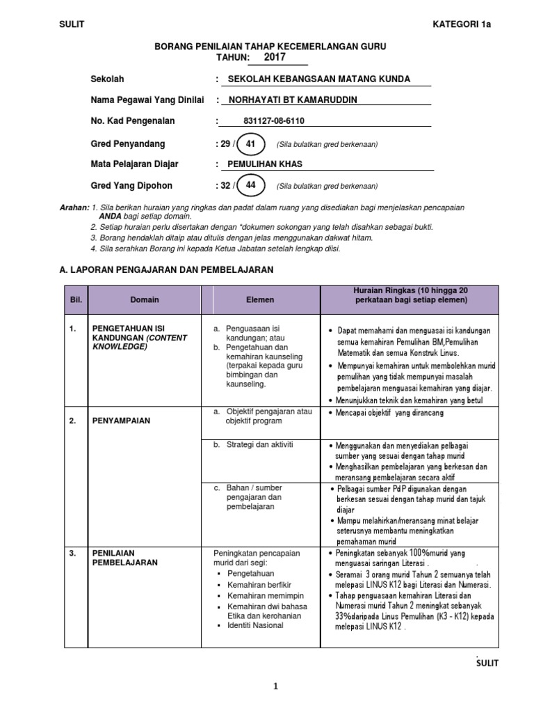 Ali Bin Ahmad No. SULIT KATEGORI 1a CONTOH BORANG PENILAIAN TAHAP KECEMERLANGAN GURU TAHUN. Doc borang penilaian tahap kecemerlangan guru borang mp3 mp4.