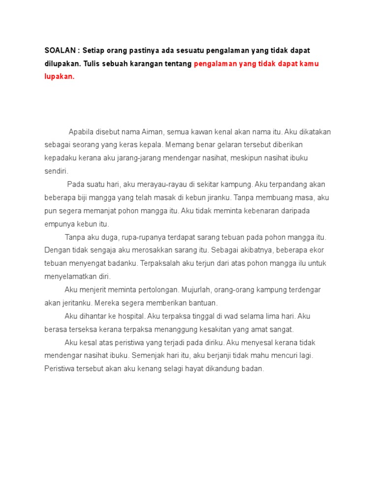Karangan bahasa inggeris tempat yang tidak boleh dilupakan. Karangan bahasa melayu tingkatan 2 2018 kandungan akta keselamatan dan kesihatan pekerjaan 1994 karangan cara mengatasi masalah obesiti dalam kalangan kanak kanak kanak kanak pintar cerdas karangan adat dan budaya rakyat malaysia karangan bahasa melayu. Tulis satu karangan yang bertajuk Pengalaman yang Tidak Dapat Dilupakan Pada tahun lalu aku menghabiskan cuti persekolahan di kampung bersama datuk dan nenek. Karangan merupakan suatu bentuk hasil pemikiran manusia yang diungkapkan lewat sebuah tulisan dan membahas suatu tema tertentu berdasarkan imajinasi ataupun gagasan dari si pengarang.