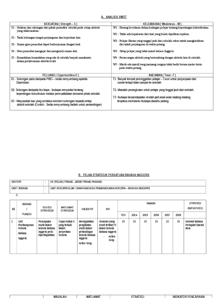 CONTOH ANALISIS SWOT PERANCANGAN STRATEGIK BAHASA INGGERIS 2010-2014 KEKUATAN STRENGTH S KELEMAHAN WEAKNESS W S1. Meningkatkan penguasaan kosa kata dalam Bahasa Inggeris. GARIS PANDUAN PERSEDIAAN CALONdoc.
