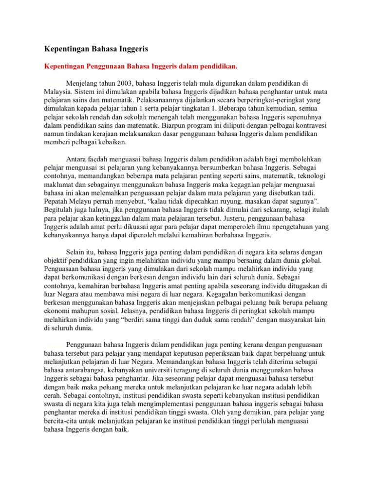 Kepentingan Bahasa Inggerris dalam Pendidikan. CONTOH KARANGAN SPM KEPENTINGAN MENGUASAI BAHASA INGGERIS Sebelum ini mutu pencapaian bahasa Inggeris di negara kita menampakkan kemerosotan yang ketara. Di Sarawak pelaksanaannya dimulakan pada tahun 1977 iqitu untuk darjah 1.