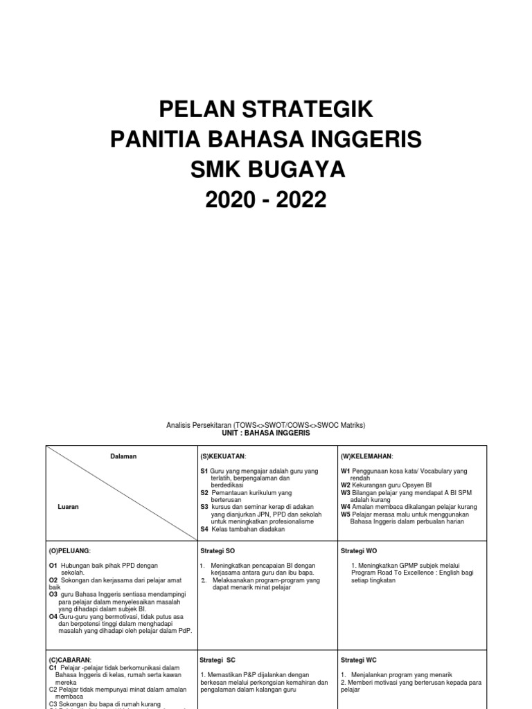 Keberkesanan dan kejayaan pelan ini adalah bergantung kepada komitmen pihak. Perancangan strategik panitia bahasa inggeris isu strategik. Untuk menjayakan visi AJK panitia Bahasa Inggeris perlu.