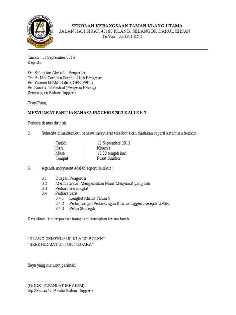 Surat Panggilan Mesyuarat Panitia Bahasa Inggeris Kali Ke 3 Pdf